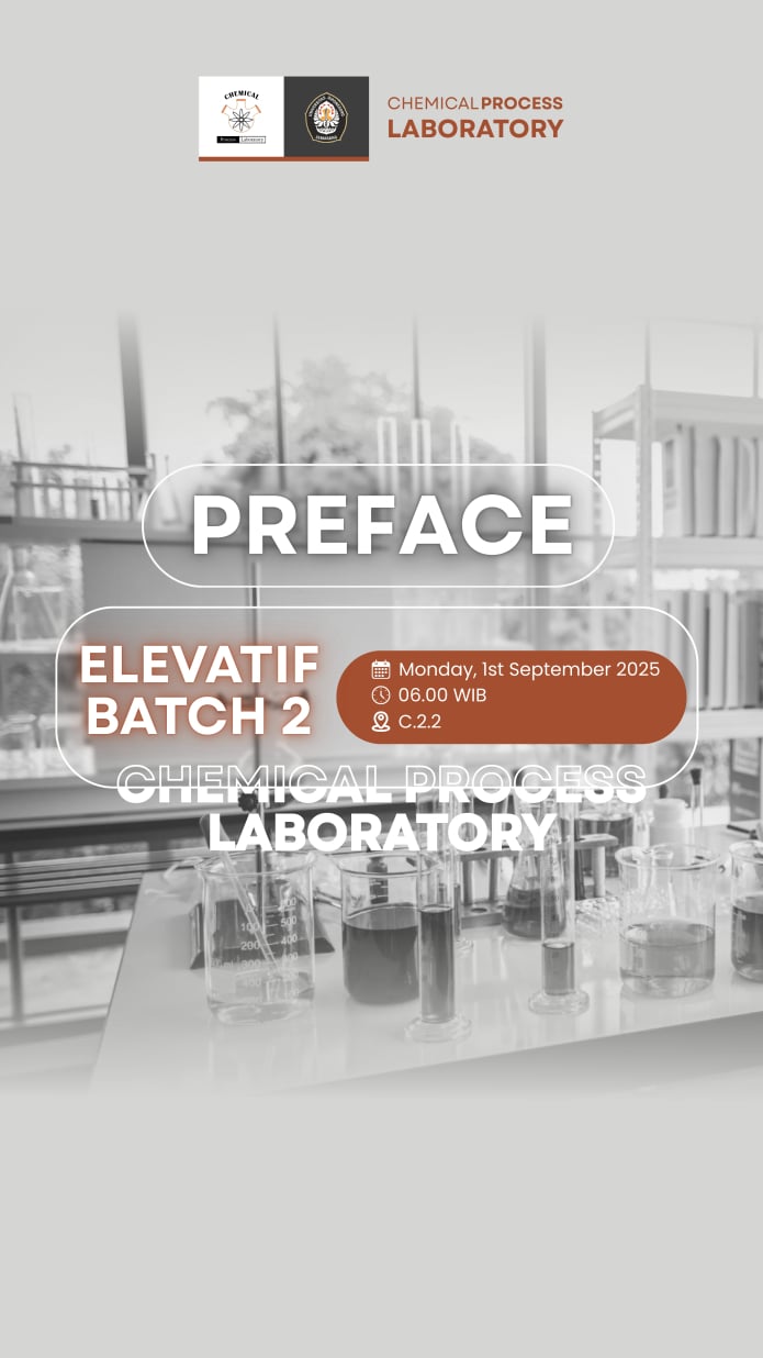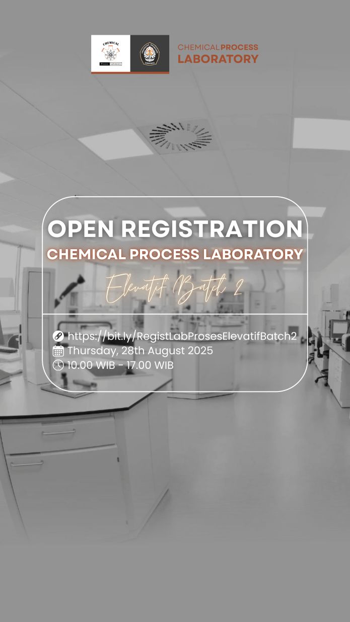 The Chemical Process Laboratory is under the coordination of the Department of Chemical Engineering, Faculty of Engineering, Diponegoro University. The Chemical Process Laboratory is located on the 2nd Floor of Integrated Laboratory, Diponegoro University. The lecturer in charge of the Diponegoro University Chemical Process Laboratory is Prof. Dr. Moh. Djaeni, S. T., M. Eng. and Abdurrahman Fawwaz as Coordinator of the Chemical Process Laboratory Assistant. The Chemical Process Laboratory has 16 laboratory assistants and 1 laborant. Diponegoro University Chemical Process Laboratory plays an important role as an implementer of chemical process practicum which is a compulsory subject of the Chemical Engineering department, Diponegoro University.